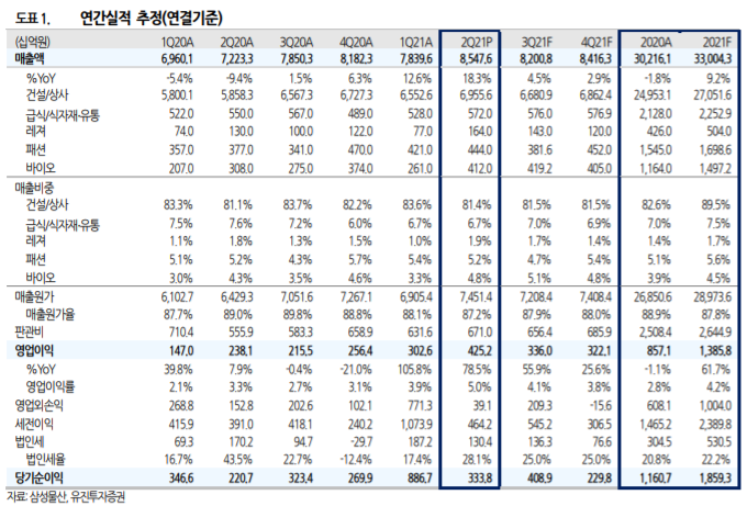 삼성물산의 2분기 매출액, 영업이익은 각각 8.5조원, 4,252억원으로 컨센서스(매출액 7.9조 원, 영업이익 3,225억원)을 대폭 상회했다. 서프라이즈의 원인은 본업인 상사, 패션과 바이오 부문의 마진율 상승때문이다. 철강, 화학 등 트레이딩 하는 상품가격의 상승이 2분기에도 이 어졌다. 패션도 영업이익률이 9.7%로 급상승했다. 바이오부문(삼성바이로직스)은 ASP 높은 CMO 생산이 증가하고 COVID-19 치료제 생산이 더해져 영업마진율이 분기 사상 최고인 41%를 기록했다. 하반기에 COVID-19 상황이 호전되지 않아 패션, 레져 등의 개선세가 약 해져도 레벨업된 바이오부문이 이익감소를 상쇄해줄 것으로 판단된다.