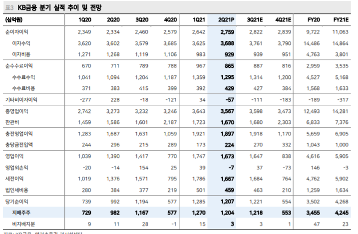 - 비은행 이익에서 KB증권 분기순익 2,211억원(YoY 흑전), 카드 1,415억원(YoY+72.4%), 캐피탈 539억원(YoY+37.2%), 푸르덴셜생명 1,121억원을 기록하며 큰 폭의 실적 개선을 시현함.