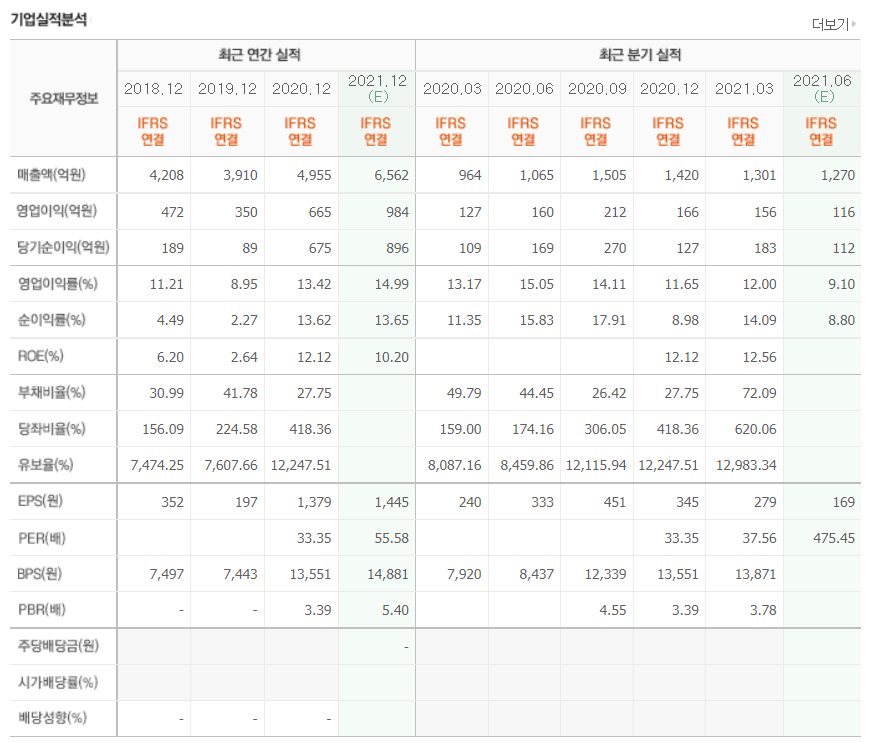 - 기업실적표를 보면, 모든지표들의 상승하고 있는 상황입니다. 매출액도 꾸준히 상승하고 있으며, 그에 다른 영업이익과 당기순이익도 작년대비 큰폭으로 상승을 전망하고 있습니다.