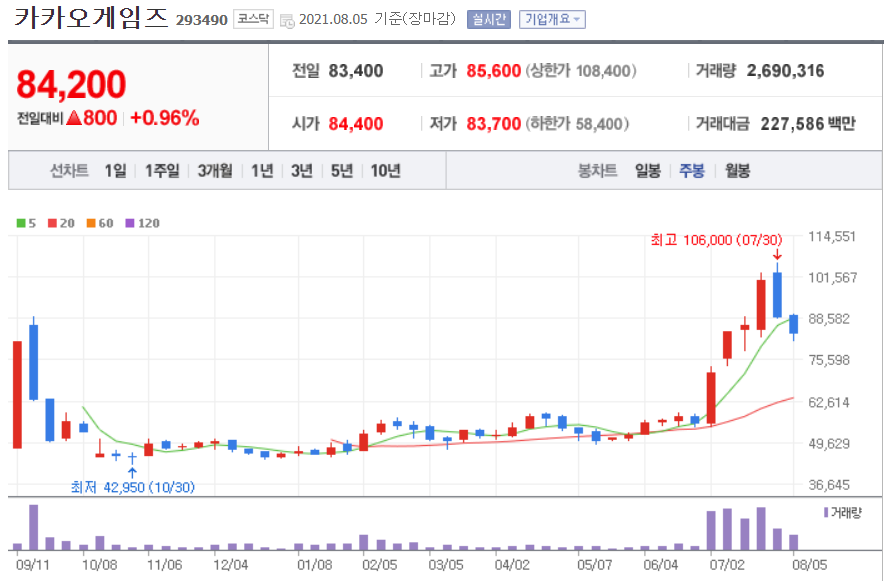 - 카카오게임즈는 상장 후에 공모주들의 수익실현으로 42000원대를 찍고 지속적으로 소폭 상승해왔으며, 최근들어 자사 게임 오딘의 흥행으로 인해 다시 급등하고 있는 모습을 보여주고 있다.