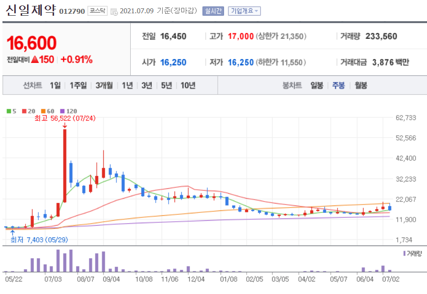 - 신일제약은 덱사메타손의 코로나19 치료제로서의 가치가 있다는 기사들과 전망이 쏟아지면서, 동반상승하였다가 잠잠해지자 주가가 하락 후 지속 박스권을 형성해오고 있습니다.