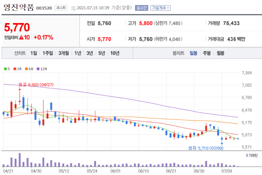 지난해 7월 영진약품이 코로나19로 주목받던 덱사메타손을 주성분으로 하는 전문의약품 덱사코티실정을 제조하고 있다는 이유에서, 상한가를 기록하며 2배이상이 주가 상승을 한 이후로는 하락하여, 급등전 주가에서 박스권을 형성하고 있습니다.
